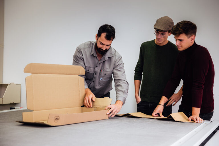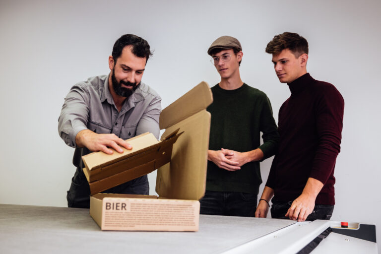 In enger Zusammenarbeit erarbeitet unser Entwicklungsteam Verpackungsvorschläge und präsentiert die Möglichkeiten. In Live-Präsentationen können die beiden Unternehmer die Verpackung und deren Funktionalität testen: